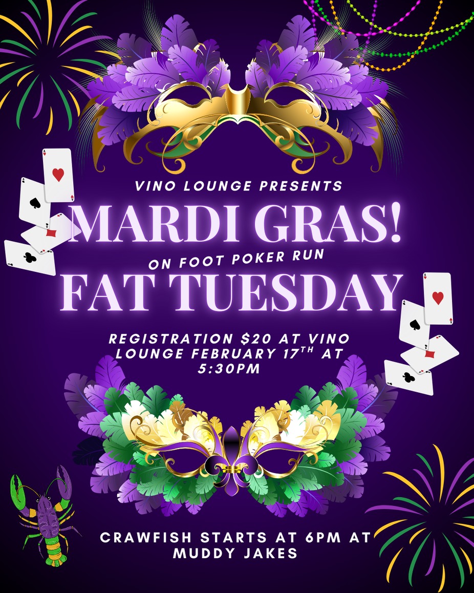 Shuffle up and let the good times roll! Vino Lounge is bringing the beads, booze, and cards! Join us February 17th at 5:30PM. Registration is $20 and all proceeds go to the winner! Additionally Muddy Jakes will be serving crawfish at 6PM! Come join all the fun!!